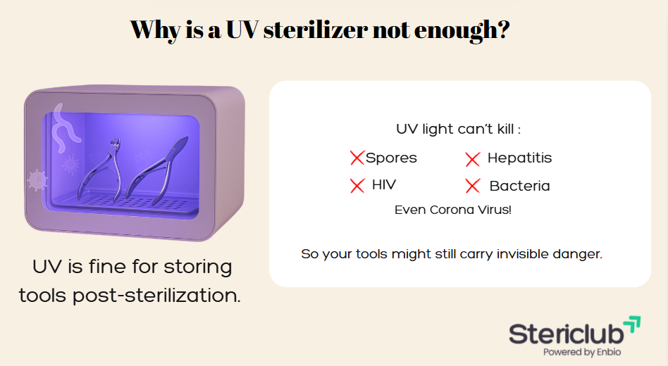 Most salons in India still rely on UV cabinets or disinfectant dips, which only clean the surface. Tools that go from one client to another — like nippers, tweezers, or scissors — can still carry pathogens such as Hepatitis B, fungal infections, or staph bacteria.